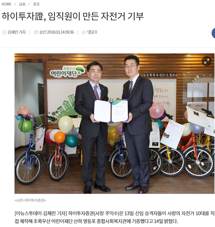 [이뉴스투데이 등] 하이투자證, 임직원이 만든 자전거 기부