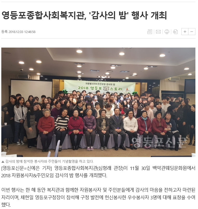 [영등포신문] 영등포사회복지관, '감사의 밤' 행사 개최