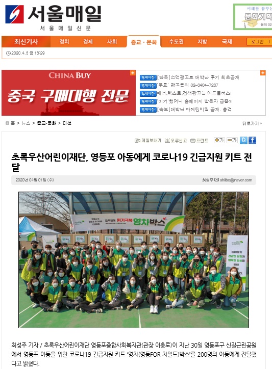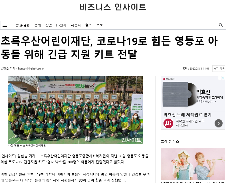 【서울매일, 인사이트】 초록우산어린이재단, 영등포 아동에게 코로나19 긴급지원 키트 전달