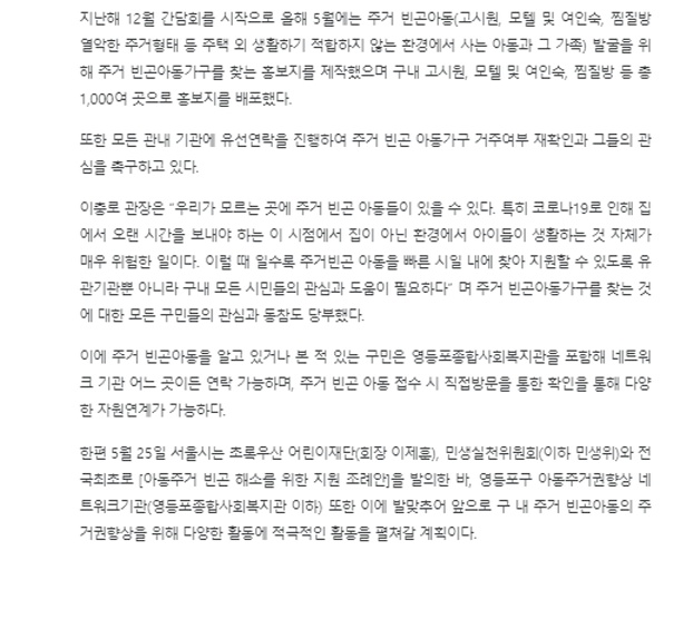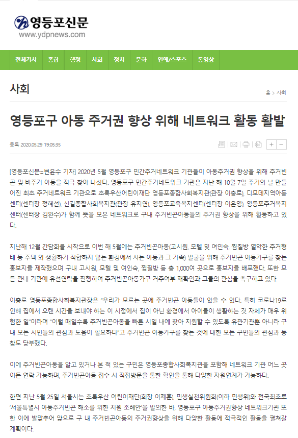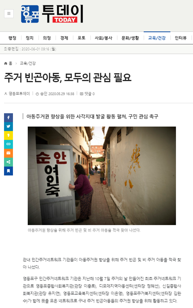【영등포투데이, 영등포신문】 주거빈곤아동, 모두의 관심 필요
