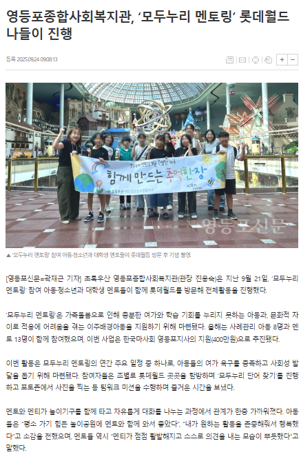 [영등포신문, 영등포투데이] 영등포종합사회복지관, 아동 맞춤형 성장 지원 '모두누리 멘토링' 롯데월드 나들이