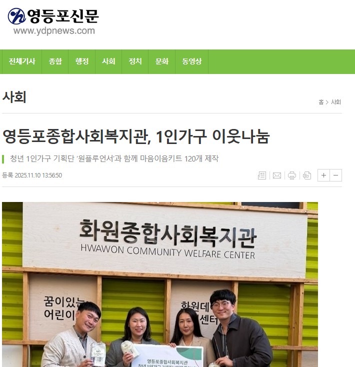 [영등포투데이, 영등포시대, 영등포신문] 영등포종합사회복지관, 청년 1인가구 기획단 ‘원플루언서’ 마음이음키트 120개 제작...1인가구 이웃나눔 실천