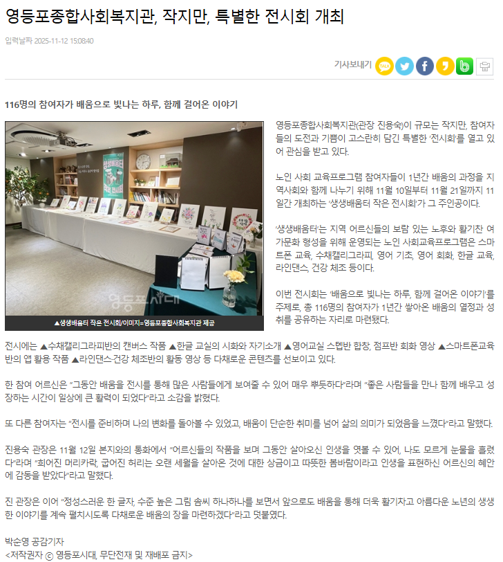 [영등포투데이, 영등포시대, 영등포신문] 영등포종합사회복지관, 2025 노인사회교육프로그램 생생배움터 작은 전시회 개최