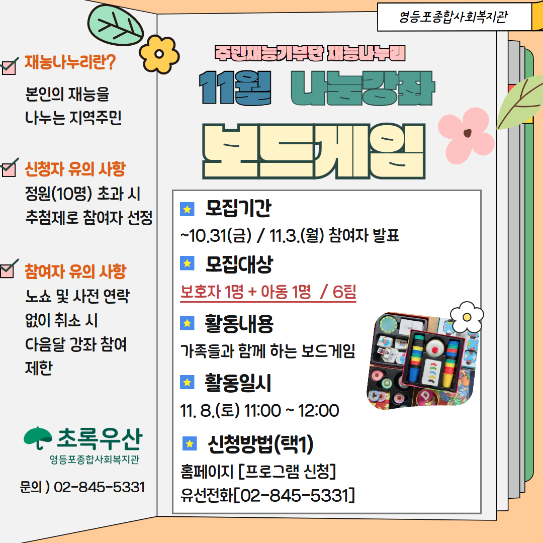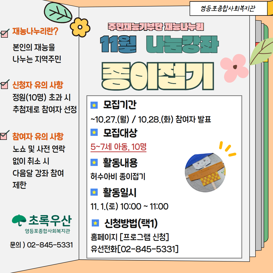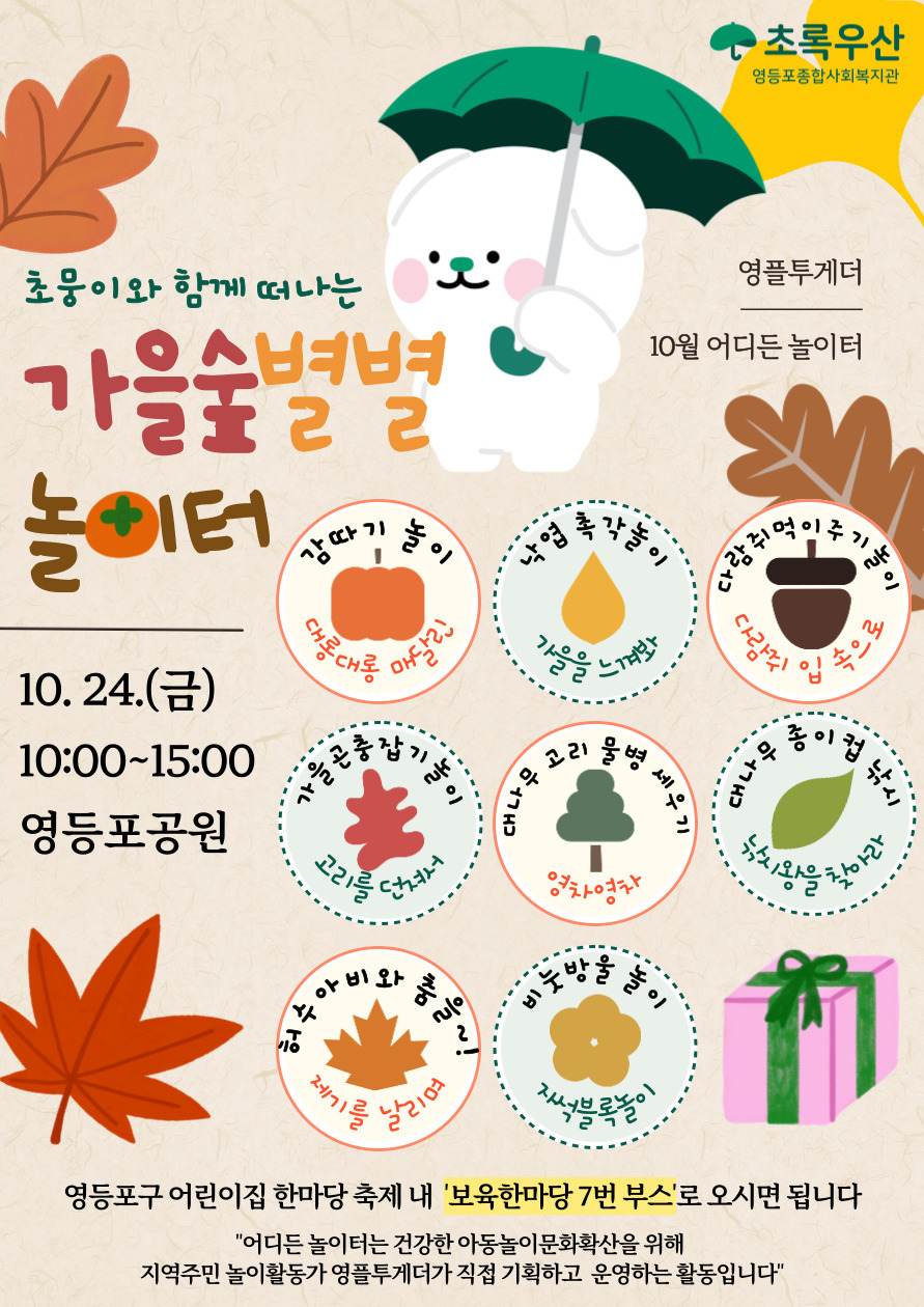 2025년 9월 13일, 신길근린공원에서 신오마을, 꼬꼬마 축제를 개최하였는데요. 본 복지관도 네트워크 협력활동으로 꼬꼬마 축제에 참여하였어요.신오마을 꼬꼬마 축제에는 다양한 체험활동과 더불어서 맛있는 간식과 함께 영화도 즐길 수 있는 축제인데요!삼삼오오, 다양한 연령대와 많은 가족들이 놀러오기 때문에 복지관은 ’복지관 홍보’, ‘주민만남 및 주민의견조사’를 하기 위해 부스를 운영했답니다.의견조사에는 [복지관 이용유무], [연령대 별 희망 프로그램의 주제], [참여 희망 시간대] 대해 물었고 총 179명이 참여했답니다. 성인들에게는 QR코드로 응답할 수 있는 설문조사를 실시하고, 핸드폰이 없거나 응답하기 어려운 주민들에게는 스티커로 답변하는 형태로 의견조사를 실시했어요. 의견조사 응답자 중 70% 이상이 복지관을 이용한 적이 없다고 답변주었는데요,그 이유는, ‘어떠한 것이 있는지 몰라서’ 였다고 해요.더욱 복지관 홍보를 열심히 해야겠다라는 생각이 들었답니다. 또한 아동, 어르신, 성인에게 어떤 프로그램을 희망하는지에 대한 답변은 압도적으로 ‘축제’ ‘행사’의 비율이 1위였답니다.오늘과 같이 여가, 놀이, 체험을 모두 즐길 수 있는 축제, 행사를 복지관에 기대하고 있다는 것을 알 수 있었답니다. 의견조사에 참여하면 룰렛을 돌려 푸짐한 선물도 팡팡팡! 복지관 홍보물품인 칫솔세트, 장바구니부터 아이들이 좋아하는 간식까지! 과연 무엇이 나올까 두근두근! 영등포종합사회복지관의 부스에 놀러왔는데 그냥 가면 섭하죠~누구나 참여할 수 있는 '압화 책갈피 만들기' 활동도 진행했는데요,형형색색의 압화로 책갈피를 만드는 활동은 아이들에게 인기만점! 개성 있는 압화책갈피가 만들어졌답니다.그리고, 이 순간이 추억이 되었으면 하는 바람과 함께 ‘영복이의 추억나무’도 선보였는데요,‘복지관과의 추억', '복지관 응원문구'를 참여자들이 써주었답니다. '제일 나 다울 수 있었던 추억을 만들어준 2024년의 영복이의 순간이 떠올라요. 고맙습니다.''삶의 활력소, 힐링의 종착점, 행복의 마중물, 그곳이 바로 영등포종합사회복지관입니다.''복지관은 다양한 체험거리가 있어서 너무 좋아요. ''가장 소중한 추억이자 기억입니다. 영복이 최고!!!''축제 때 마다 항상 즐거운 행사 감사해요.' 다양한 의견과 소감을 남겨주신、참여자들께 감사의 인사를 전합니다! 이번 활동으로 영등포종합사회복지관을 더욱 알리는 계기가 되었길 바라보며, 앞으로도, 이웃과 밀착하기 위한 활동들을 다양하게 전개 할 예정이니 많은 관심 부탁드립니다!