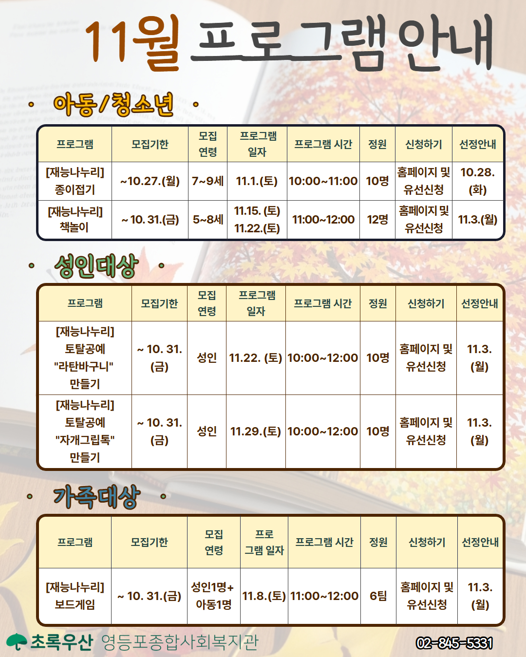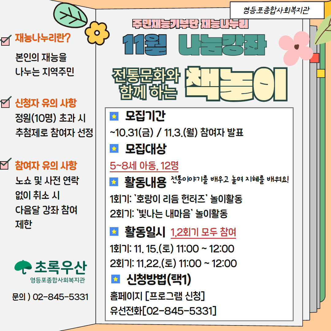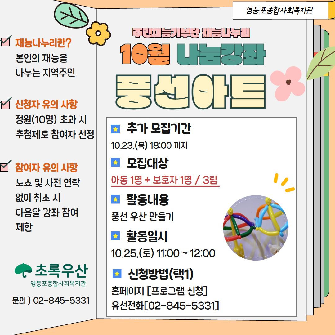 2025년 9월 13일, 신길근린공원에서 신오마을, 꼬꼬마 축제를 개최하였는데요. 본 복지관도 네트워크 협력활동으로 꼬꼬마 축제에 참여하였어요.신오마을 꼬꼬마 축제에는 다양한 체험활동과 더불어서 맛있는 간식과 함께 영화도 즐길 수 있는 축제인데요!삼삼오오, 다양한 연령대와 많은 가족들이 놀러오기 때문에 복지관은 ’복지관 홍보’, ‘주민만남 및 주민의견조사’를 하기 위해 부스를 운영했답니다.의견조사에는 [복지관 이용유무], [연령대 별 희망 프로그램의 주제], [참여 희망 시간대] 대해 물었고 총 179명이 참여했답니다. 성인들에게는 QR코드로 응답할 수 있는 설문조사를 실시하고, 핸드폰이 없거나 응답하기 어려운 주민들에게는 스티커로 답변하는 형태로 의견조사를 실시했어요. 의견조사 응답자 중 70% 이상이 복지관을 이용한 적이 없다고 답변주었는데요,그 이유는, ‘어떠한 것이 있는지 몰라서’ 였다고 해요.더욱 복지관 홍보를 열심히 해야겠다라는 생각이 들었답니다. 또한 아동, 어르신, 성인에게 어떤 프로그램을 희망하는지에 대한 답변은 압도적으로 ‘축제’ ‘행사’의 비율이 1위였답니다.오늘과 같이 여가, 놀이, 체험을 모두 즐길 수 있는 축제, 행사를 복지관에 기대하고 있다는 것을 알 수 있었답니다. 의견조사에 참여하면 룰렛을 돌려 푸짐한 선물도 팡팡팡! 복지관 홍보물품인 칫솔세트, 장바구니부터 아이들이 좋아하는 간식까지! 과연 무엇이 나올까 두근두근! 영등포종합사회복지관의 부스에 놀러왔는데 그냥 가면 섭하죠~누구나 참여할 수 있는 '압화 책갈피 만들기' 활동도 진행했는데요,형형색색의 압화로 책갈피를 만드는 활동은 아이들에게 인기만점! 개성 있는 압화책갈피가 만들어졌답니다.그리고, 이 순간이 추억이 되었으면 하는 바람과 함께 ‘영복이의 추억나무’도 선보였는데요,‘복지관과의 추억', '복지관 응원문구'를 참여자들이 써주었답니다. '제일 나 다울 수 있었던 추억을 만들어준 2024년의 영복이의 순간이 떠올라요. 고맙습니다.''삶의 활력소, 힐링의 종착점, 행복의 마중물, 그곳이 바로 영등포종합사회복지관입니다.''복지관은 다양한 체험거리가 있어서 너무 좋아요. ''가장 소중한 추억이자 기억입니다. 영복이 최고!!!''축제 때 마다 항상 즐거운 행사 감사해요.' 다양한 의견과 소감을 남겨주신、참여자들께 감사의 인사를 전합니다! 이번 활동으로 영등포종합사회복지관을 더욱 알리는 계기가 되었길 바라보며, 앞으로도, 이웃과 밀착하기 위한 활동들을 다양하게 전개 할 예정이니 많은 관심 부탁드립니다!