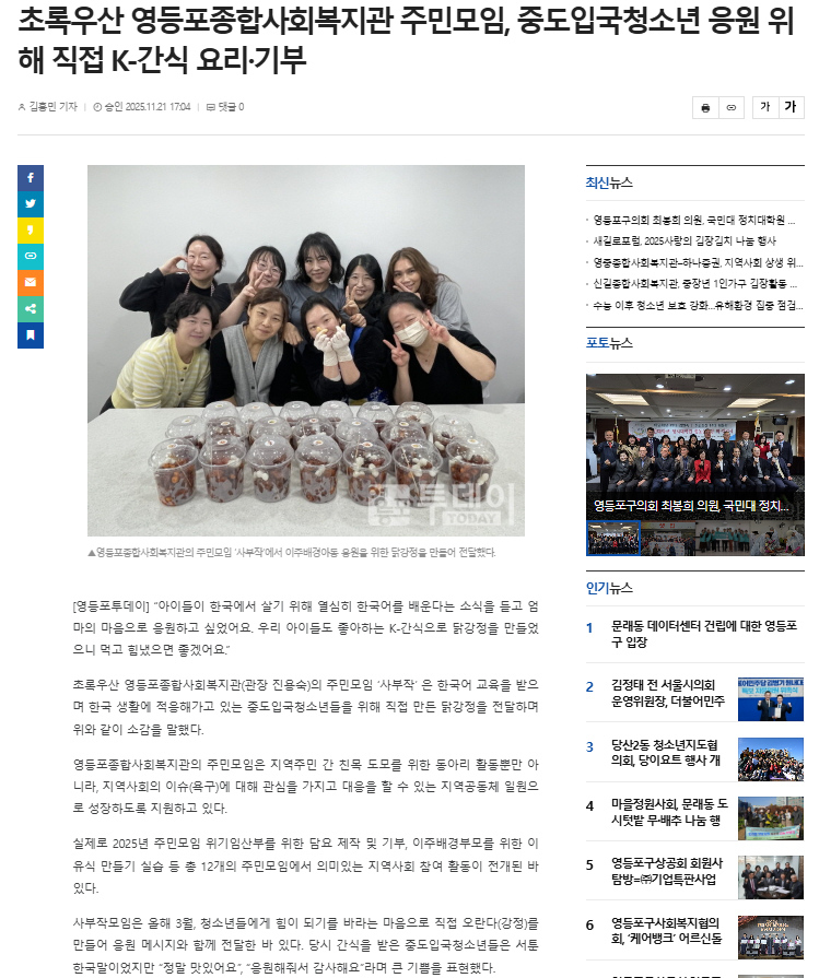 지난 2025년 11월 1일, 활기 넘치는 신길뉴타운에서 아파트 연합 축제가 열렸는데요, 이 축제는 신길동 센트럴아이파크, 센트럴자이, 래미안 아파트 주민들이 스스로 만들어가는 의미 있는 연합 축제랍니다.우리 복지관은 지역 주민들이 함께하는 이 축제를 발판 삼아,다문화 감수성을 높이고 마을활동가의 소중한 활동을 알리고자 축제에 참여했습니다!"문화가 다르다고 하여 틀린 것이 아닌, 다만 익숙해지는 과정이 필요하다."는 따뜻한 메시지를 담아서 [여행스타일로 알아보는 친구 만들기 테스트],[다양한 국적의 언어로 만드는 책갈피] 활동을 하였고총 280명의 지역주민이 참여하였습니다. 특히, 마을활동가들이 영등포구에 거주하는 이주배경주민들의 현황을 설명하고 이들을 위해 고민하며 활동하는 마을활동가 ‘큰숲지기’를 소개하는 시간을 가졌는데요, "영등포구가 2위에요? 1위는 어디예요?""저희 반에도 미국인 친구 있어요!""잘 몰랐는데, 외국인들이 이렇게 많은지 몰랐어요.“참여자들의 생생한 반응은 이주배경주민에 대한 관심과 이해의 폭을 넓히는 소중한 기회가 되었습니다. 또한, 간단하면서도 의미 있는 체험활동으로, '우리가 외국인 이웃을 만날 때 어떤 방법으로 다가가면 좋을까?'를 함께 고민해보는 시간을 가졌습니다.[여행 스타일로 알아보는 친구 만들기] 테스트를 통해 본인의 성격 및 성향에 맞는 실천적인 방법을 알아볼 수 있었는데요. 아이들뿐만 아니라 어른들도 재미있게 참여하며 공감하는 모습이었습니다.참여자들은 ‘따뜻한 인사 건네보기’ ‘점심시간에 혼자 있는 친구에게 밥 같이 먹자고 제안해보기’'편견의 시선으로 바라보지 않기' 등 따뜻한 약속을 실천하기로 다짐하며, 약속의 의미를 담아 [약속 트리]에 지장을 남기기도 했답니다! 그리고 필리핀, 베트남에서 인기 있는 맛있는 간식은 덤~~! 여기서 멈추면 아쉽죠! 다양한 국적의 언어도 함께 알아보고자, 캘리그라피로 [사랑해], [친구]라는 단어를 책갈피에 직접 써보는 시간을 가졌습니다.“아까 여행 스타일 테스트에 베트남 여행지가 나와서 베트남 언어를 골랐어요.”“아랍어는 처음 봐요. 신기해요.”“친구라는 단어가 다른 언어가 예뻐 보여서 더 잘 쓰고 싶어요.”한국어뿐만 아니라, 다양한 국적의 언어에 관심을 갖게 되는 소중한 시간이었습니다. 정성껏 연습한 흔적들까지도 모두 아름답지 않나요?!이주배경주민, 낯설지만 점차 익숙해질 수 있도록, 서로 다름을 인정하고 존중하며 함께 살아가는 따뜻한 지역사회를 만들어가기 위해 노력하겠습니다.함께 해주신 모든 분께 진심으로 감사드립니다!