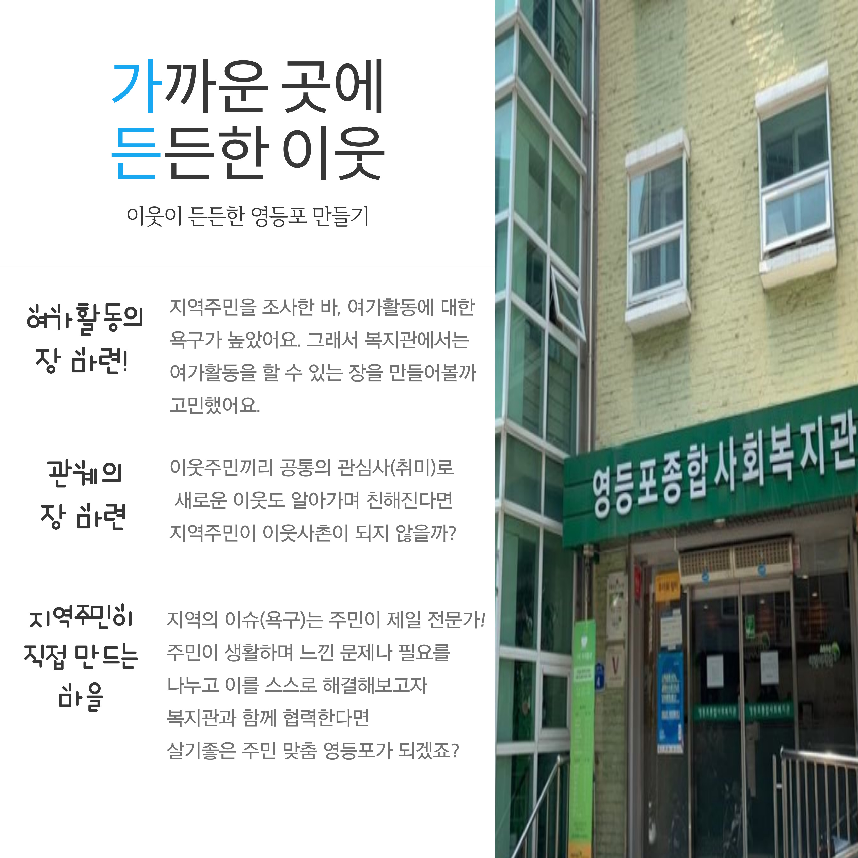 영등포종합사회복지관과 주민이 함께하는 다양한 소식을 알려드립니다.