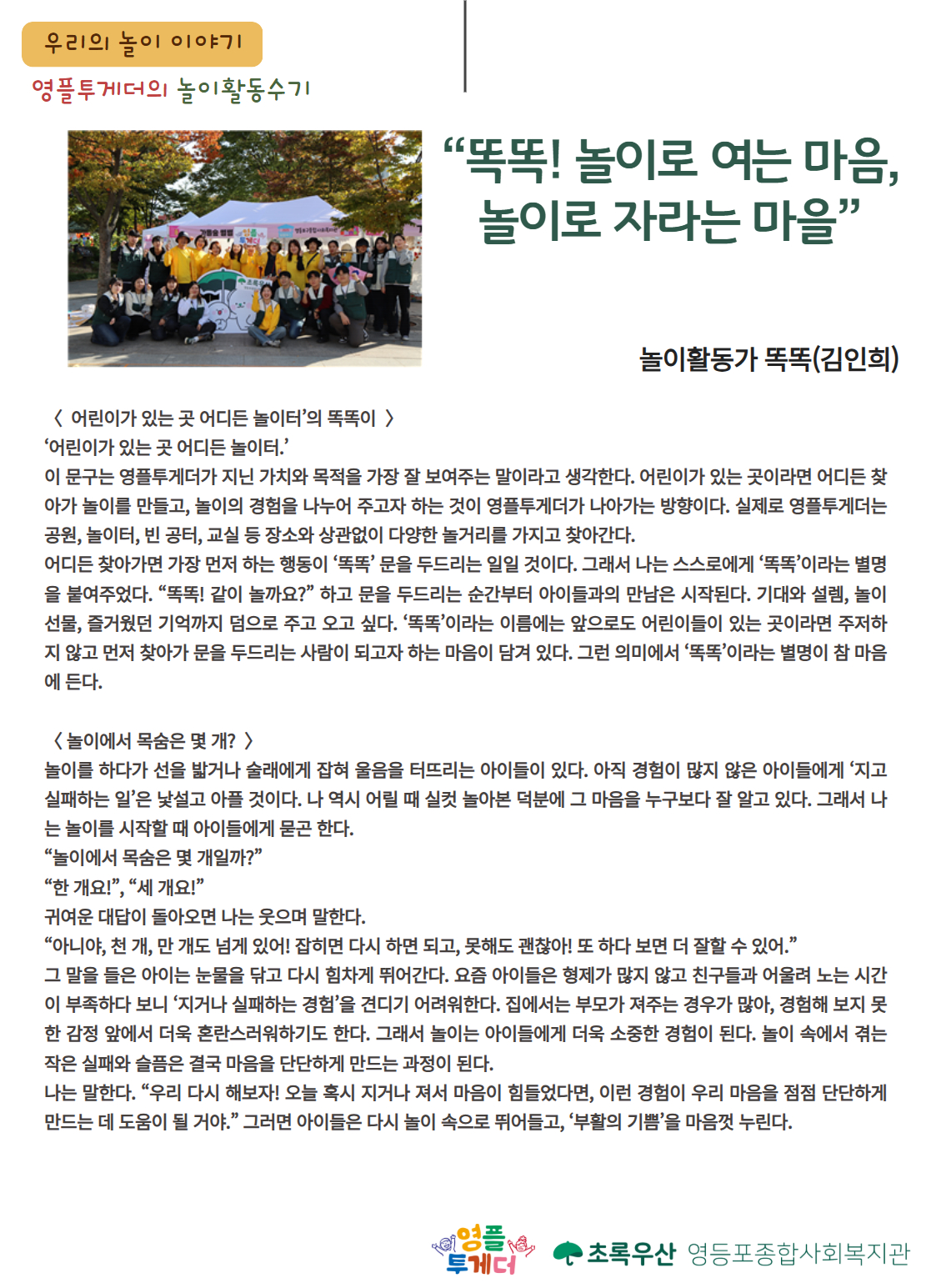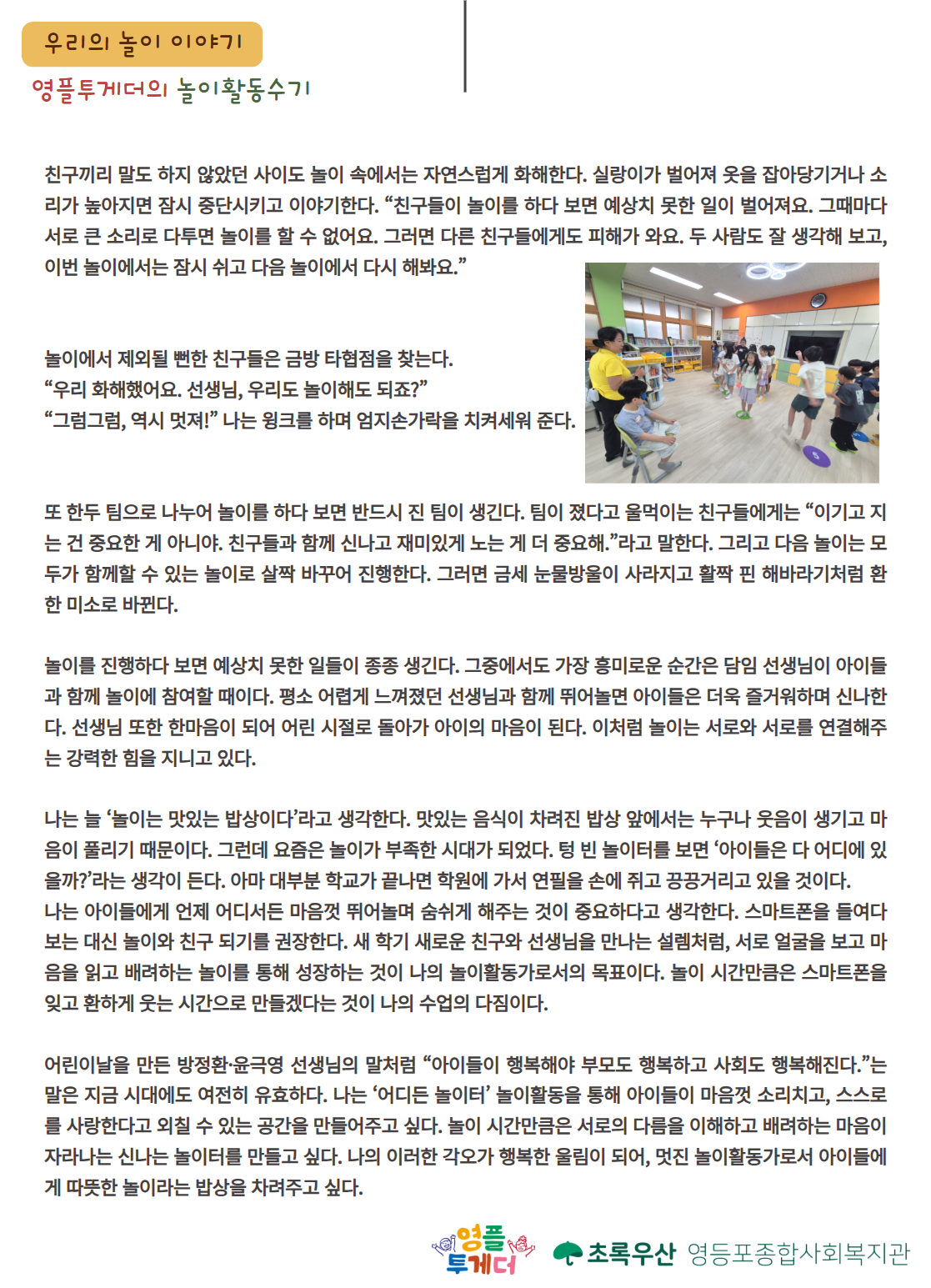 아래에 공유되는 놀이활동 수기를 통해 영플투게더의 한 해를 함께 살펴보시고, 현장에서 애써 주신 놀이활동가들에게 따뜻한 응원과 감사의 마음을 전해주시기 바랍니다.