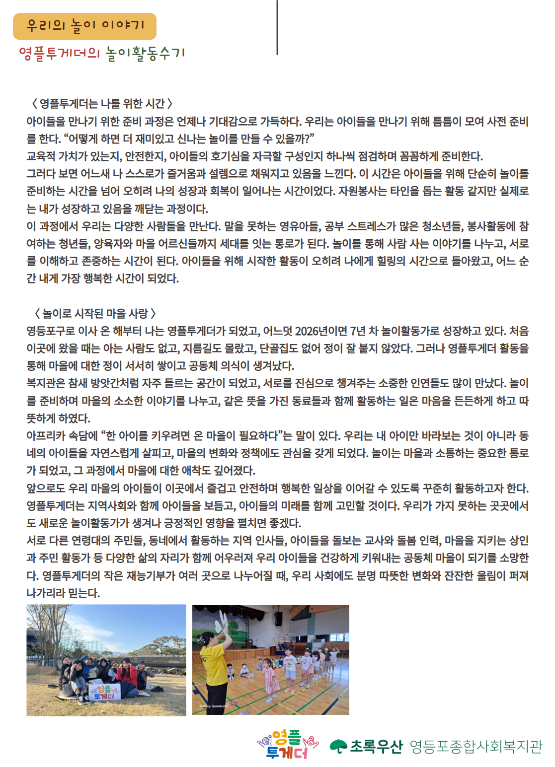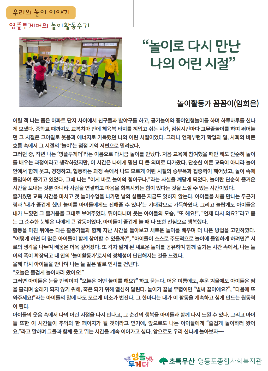 2025년 한 해 동안 영등포 지역 아동의 놀 권리 증진을 위해 함께해 온 영플투게더의 활동을 돌아보며, 올 한 해의 의미를 나누고자 합니다.